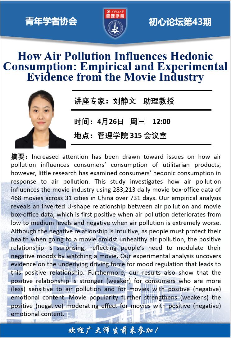 题目:How Air Pollution Influences HedonicConsumption: Empirical and ExperimentalEvidence from the Movie Industry 2023-04-19