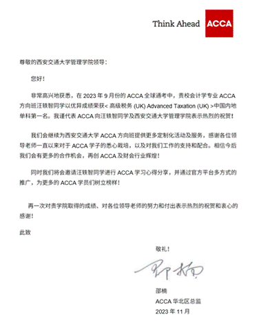 2023年11月7日,ACCA协会(特许公认会计师公会The Association of Chartered Certified Accountants)给学院发来贺信,祝贺a漫