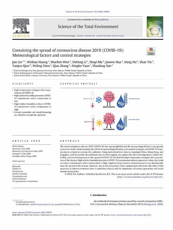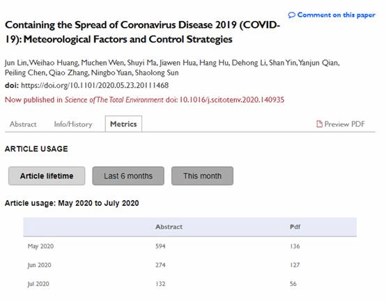 该成果以“Containing the spread of coronavirus disease 2019 (COVID-19): Meteorological factors and control strategies”为题被Science of the Total Environment接收并在线发表(图2),该期刊的最新影响因子为6.551,在环境科学200多个SCI检索期刊中排名前8.11%。截止目前为止,论文预印版已被浏览1000次,下载319次(图3)。