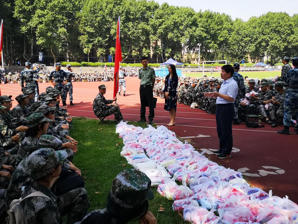 最后,大家一起为军训师生送上毛巾、洗发水、洗衣液等洗护用品,以及a漫