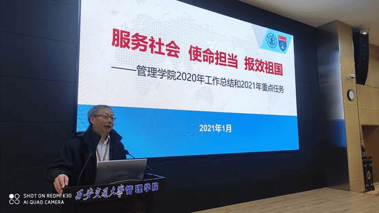 冯耕中院长在大会上以“服务社会,使命担当,报效祖国”为题总结学院一年来各项事业所取得的突出成绩,并就学院未来的发展规划和2021年重点工作部署进行了介绍,提出“发展是硬道理”,在百年未有之大变局的背景下,管理教育要立足“两个大局”助力国家“双循环”发展新格局。报告结合寒假工作会上王校长的工作报告和卢书记的总结讲话精神,要求全院教职工正视王校长提出的“十大问题”,以需求为牵引,以问题为导向,增强创新引领,紧跟国家、地方和学校未来发展趋势,充分利用管理学科和人才队伍优势,做好育人、科研和社会服务工作,共同为“双一流”学科建设和学院发展贡献智慧,助力社会发展。冯院长强调,全院教职工要研学卢书记寒假工作会上的讲话,把握学校“十四五”期间的战略布局和重点方向,以“六进创新港”为总体规划,正确处理好五组关系,结合学院专业学科特点和优势,推进形成学科交叉、产教融合的新格局,为学院发展开创新局面,为创新港内涵建设做出应有贡献。