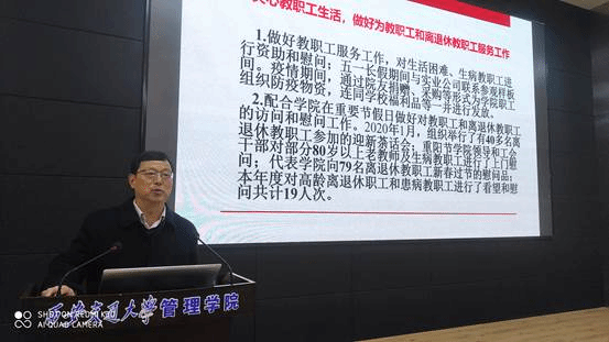 刘颖老师对2020年度学院财务工作作了通报,工会主席相里六续对院工会在2020年开展的各项工作进行总结,号召大家在2021年积极参与院工会组织的各项活动及比赛,增强体质,健康快乐的生活工作。