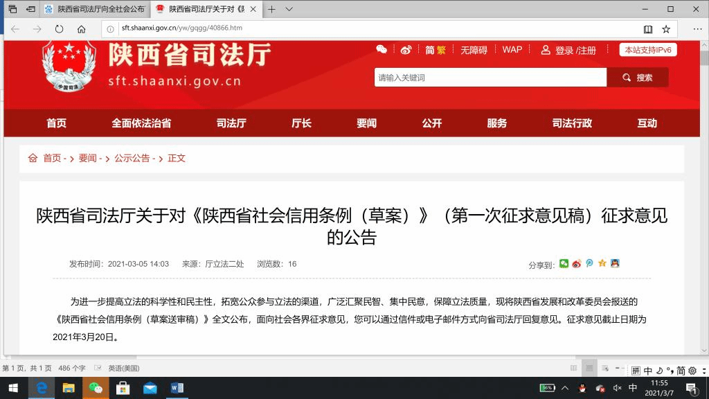 公告连接:陕西省司法厅关于对《陕西省社会信用条例(草案)》(第一次征求意见稿)征求意见的公告