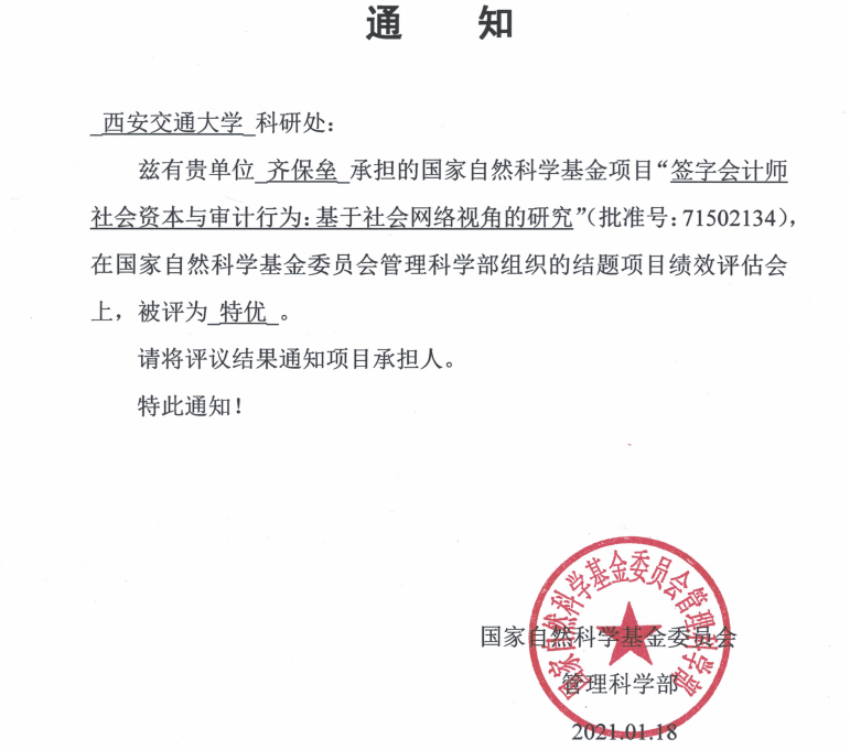 齐保垒老师承担的国家自然科学基金项目“签字注册会计师社会资本与审计行为:基于社会网络视角的研究”(批准号:71502134)被国家自然科学基金委员会管理学部评为“特优”。在该基金的资助下,齐保垒老师和团队成员在The Accounting Review(UTD24)、Accounting Horizons(国际A类期刊)、Auditing: A Journal of Practice and Theory(国际A类期刊)、Journal of Accounting and Public Policy(国际A类期刊)、Accounting and Business Research(国际B类期刊)、International Journal of Accounting(国际B类期刊)、Accounting and Finance(SSCI期刊)、Asia-Pacific Journal of Accounting and Economics(SSCI期刊)、《系统工程理论与实践》、《管理科学》、《管理评论》等国内外著名期刊发表论文20多篇,获得国内外同行的认可。2020年1月开始,齐保垒老师担任国际著名学术期刊Asia-Pacific Journal of Accounting and Economics 副主编。