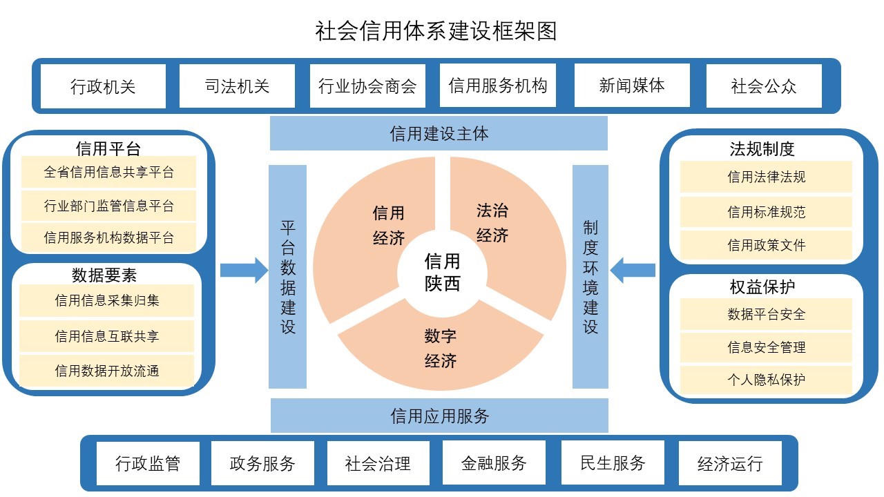 《规划》全面总结分析了我省社会信用体系建设取得的显著成绩和面临形势,明确提出“十四五”时期社会信用体系建设要紧密围绕“信用陕西”这一主题,抓住信用赋能高质量发展这一主线,实现信用信息数量和信用应用规模两个提升,建立数据要素流通、信息安全管理、新型信用监管、个人隐私保护四大机制,到2025年末,公共信用信息归集总量突破10亿条、信用承诺覆盖范围超过70%、城市信用监测平均排名位居全国前40%,为推动高质量发展、创造高品质生活、实现高效能治理创造良好的信用环境。《规划》共10章,设置了4方面13项具体指标,从8个方面提出了“十四五”时期全省社会信用体系建设的重点工作任务。《规划》设置了地方性信用法规制定、信用信息平台建设、西部特色信用产品研发、诚信文化教育培训等12个专栏,并将生态环境保护、交通运输、能源节约、卫生健康、家政养老等9个重点领域纳入了信用监管示范工程。