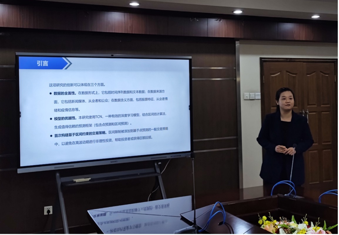 首先,由魏云捷副研究员带来名为An interval constraint-based trading strategy with social sentiment for the stock market的学术报告,该实证研究阐述了基于区间预测约束下,如何进行股票投资的策略分享。魏老师指出,通过研究可以得出,投资者情绪与股价波动相关,而基于预测框架和区间估计的创新交易策略,可以有效地引导投资者进行稳健和正确的交易的结论。