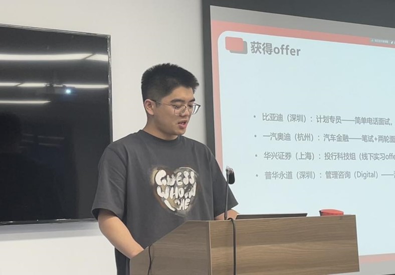 刘梦书同学建议同学们面试前要根据自己的优势劣势选择好主攻赛道,并详细介绍了简历的准备过程,叮嘱学弟学妹们对简历中的每一段经历都胸有成竹。此外,刘同学还分享了面试中各环节的细节和心得,强调了平时积累和临场发挥的重要性,鼓励大家面试结果即使不理想也不要气馁,要进行面试复盘,总结经验及时止损。