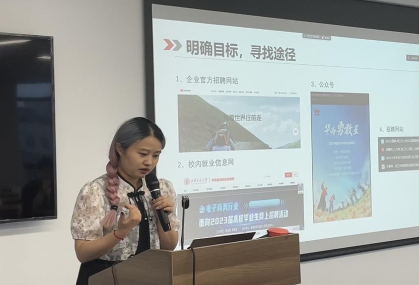 讲座开始,陈尚杰、刘梦书介绍了互联网企业就业过程中的心得。陈尚杰分享了企业官方招聘网站、高校就业网站、企业微信公众号等信息途径,叮嘱同学们秋招要多抓住来校举办就业宣讲会企业的校招机会。求职是一个长线作战,陈同学提醒大家要提前做好招聘的实习规划,善于利用表格整理就业时间线,以免遗漏错过机会。
