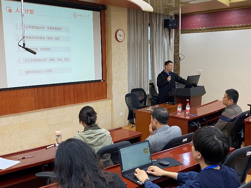 党委书记马晓彬简要介绍学院“优才”系列培训发起的背景和意义。人才队伍的稳定和提升对于学院、学科的发展至关重要。第一期活动特别安排“国家级人才项目申报”专题,是将学院教师的成长、成才发展放在学科建设的首位。希望通过辅导讲座,使得教师们对各类各级项目的申报条件、要求和政策了解学习,同时根据自身特点做好职业发展规划,明确目标,找准赛道,扎实工作,充分准备。马书记强调,我们要坚持人才是第一资源,把人才队伍建设融入学院学科发展和学校事业发展大局,进一步优化人才结构,发挥科研平台作用,培养锻炼更多高水平科研领军人才和创新团队,为推动学校各项事业高质量发展提供有力的人才支撑。