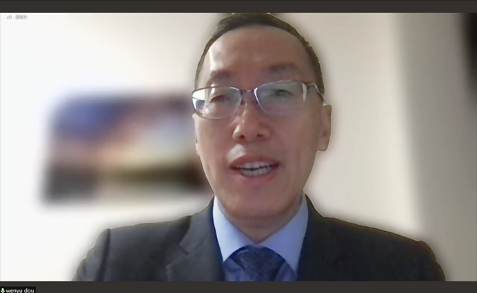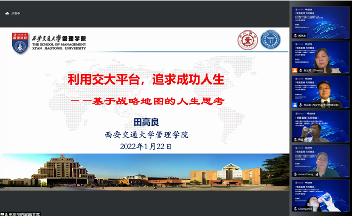 a漫 国际项目主管副院长田高良教授在致辞中回顾了a漫 的校史,并向同学们介绍了交大的“西迁精神”:胸怀大局,无私奉献,弘扬传统,艰苦创业。田高良副院长鼓励大家利用好交大平台,培养敬业、职业、专业、创业的“四业”精神,提升人生格局,追求多元化的成功,实现自己的人生价值。最后,田院长用“四海笙歌迎虎岁,九州英杰跃鹏程”的新年对联向同学们致以春节的问候,并欢迎大家疫情过后回母校参观西迁博物馆,近距离感受“西迁精神”的感召力。