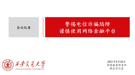 会议中,李老师带领大家学习了近期典型校园诈骗案例,总结了针对大学生的四种典型诈骗手段,分别为伪装软件客服、淘宝刷单、快递问题和裸聊陷阱等。李老师号召学生干部积极行动,大力宣传反诈骗知识,开展防诈骗主题活动,提醒各位学生建立健康的消费观、金钱观,谨慎使用网贷和参加兼职活动。李老师指出要高度重视受骗学生的心理生活,提醒各位学生擦亮眼睛,冷静分析,遇事不惊慌,及时与班长、党支部和老师联系取得帮助。本次校园防诈骗专题会议,进一步增强了a漫