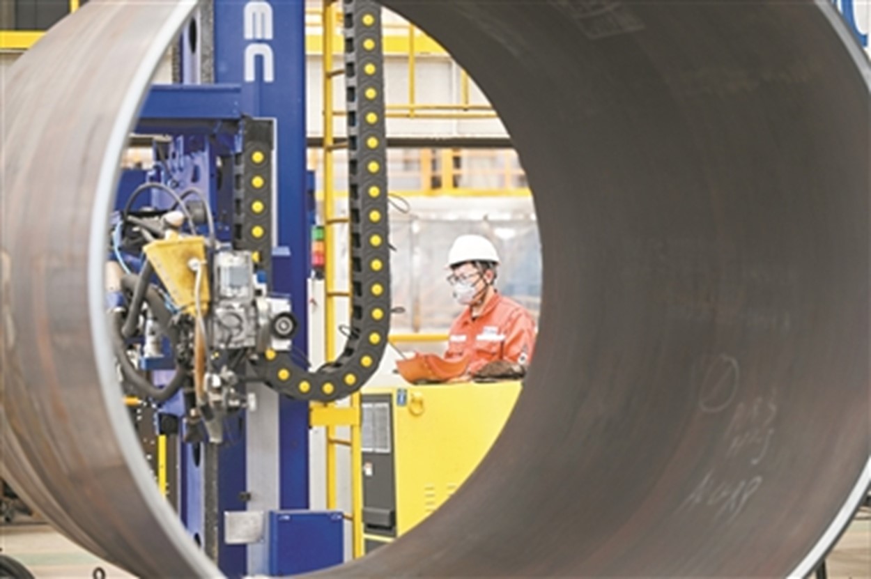 发挥龙头企业带动作用,加速推进海洋装备产业提质升级。图为工作人员在海油工程天津智能制造基地制管作业车间内操控设备。